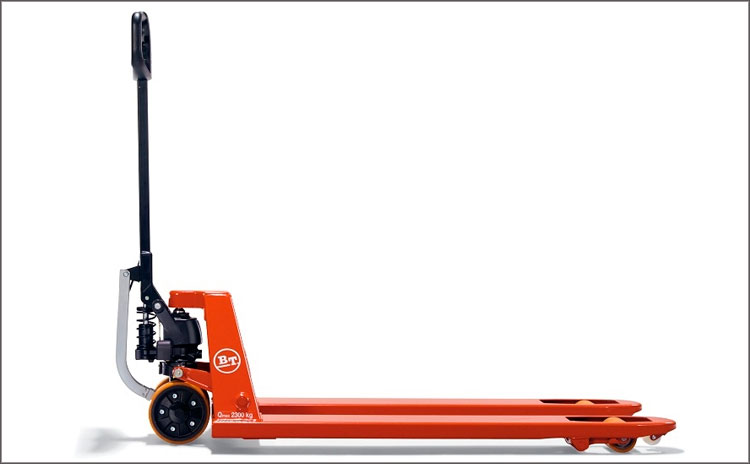 Esta robusta carretilla ofrece un fácil posicionamiento y una conducción suave con cargas pesadas, facilitando el transporte sobre superficies irregulares y umbrales. Los sólidos mandos de dirección fabricados en Powerthane ofrecen una mayor duración y comodidad para el operario. Esta carretilla tiene una capacidad de carga nominal de 2300 kg, y el bastidor de horquillas está garantizado de por vida.