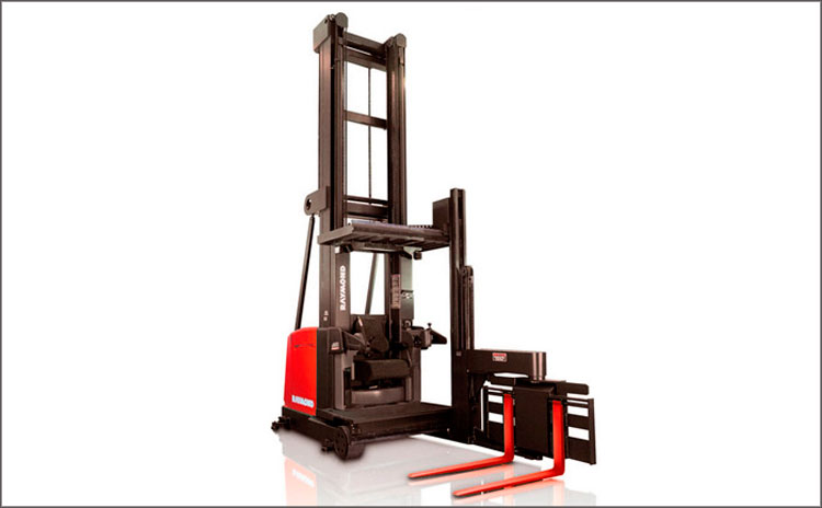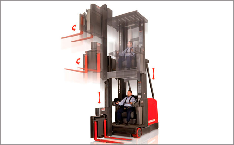 Aumenta la capacidad de almacenamiento hasta 300%:Diseñado para la manipulación de tarimas de alto nivel y versatilidad en recolección de cajas, el modelo Swing Reach de Raymond para pasillos muy angostos puede triplicar la capacidad de almacenamiento de su almacén.